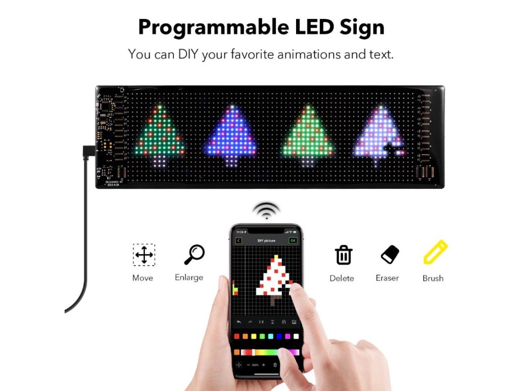 RGB LED Matrix Panel s LED diodami. Rozměr 20 x 60 cm. Celý panel je vyroben z umělých materiálů, takže je vysoce flexibilní a odolný vůči ohybům. Svícení je možné ovládat přes přibalený ovladač, nebo pomocí mobilní aplikaci, kde je také možné vytvářet své vlastní nápisy a designy. Napájení pomocí USB, kabel součástí balení.