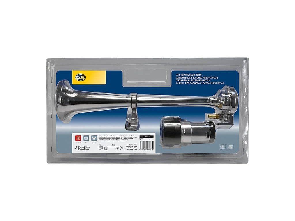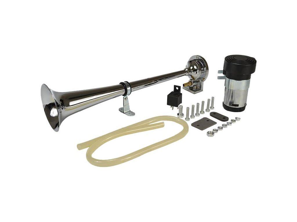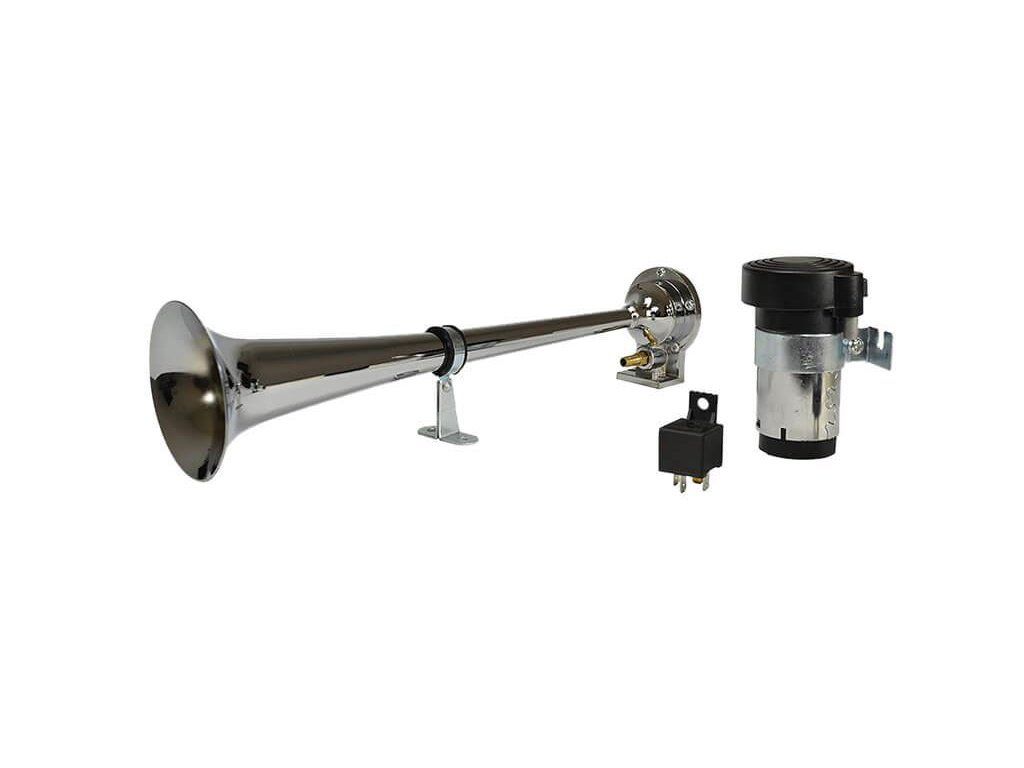 Elektrický klakson s kompresorem elektrický 12V vzduchový je velmi výkonný klakson v chromované úpravě vhodný do automobilu, nákladního vozu nebo na motocykl. Elektrický klakson s kompresorem vzduchový je vybaven spínacím relé, průhlednou vzduchovou hadicí, šrouby k přichycení a velkou troubou o délce 37 cm. Tento klakson vydává opravdu mohutný zvuk, díky kterému si Vás každý všimne.