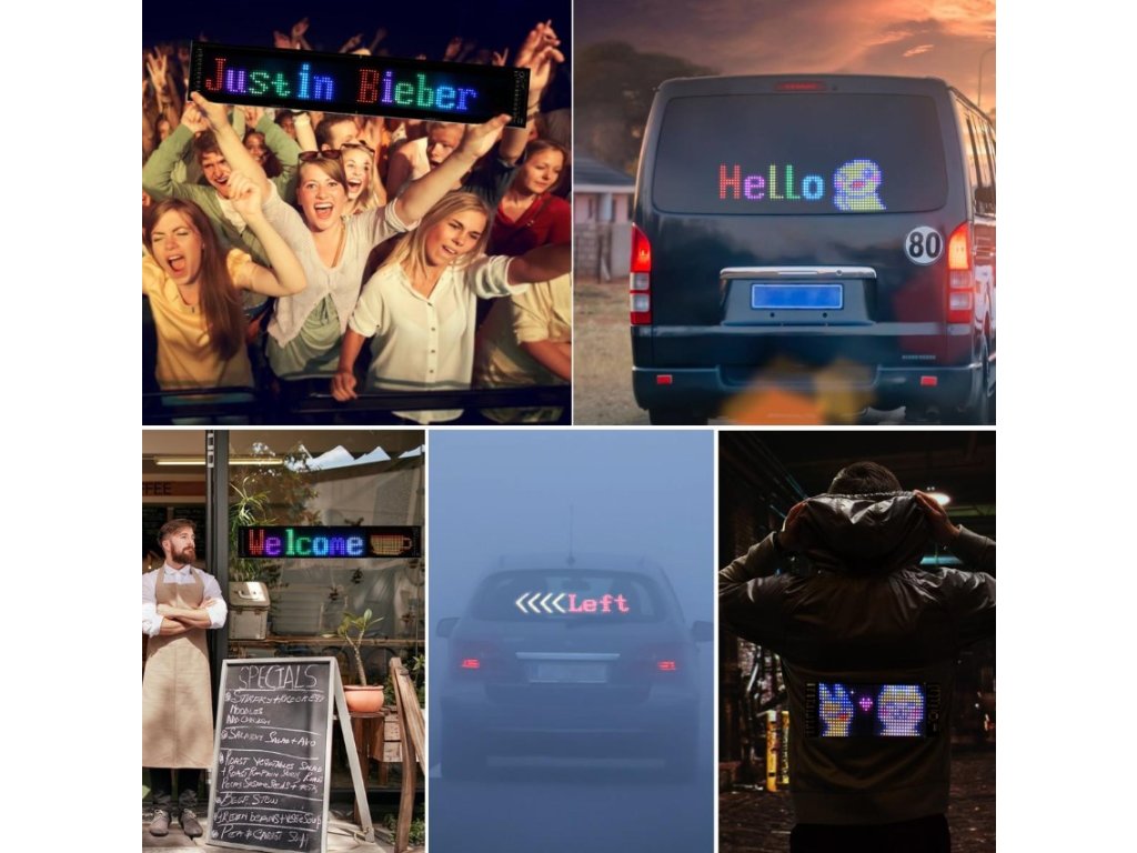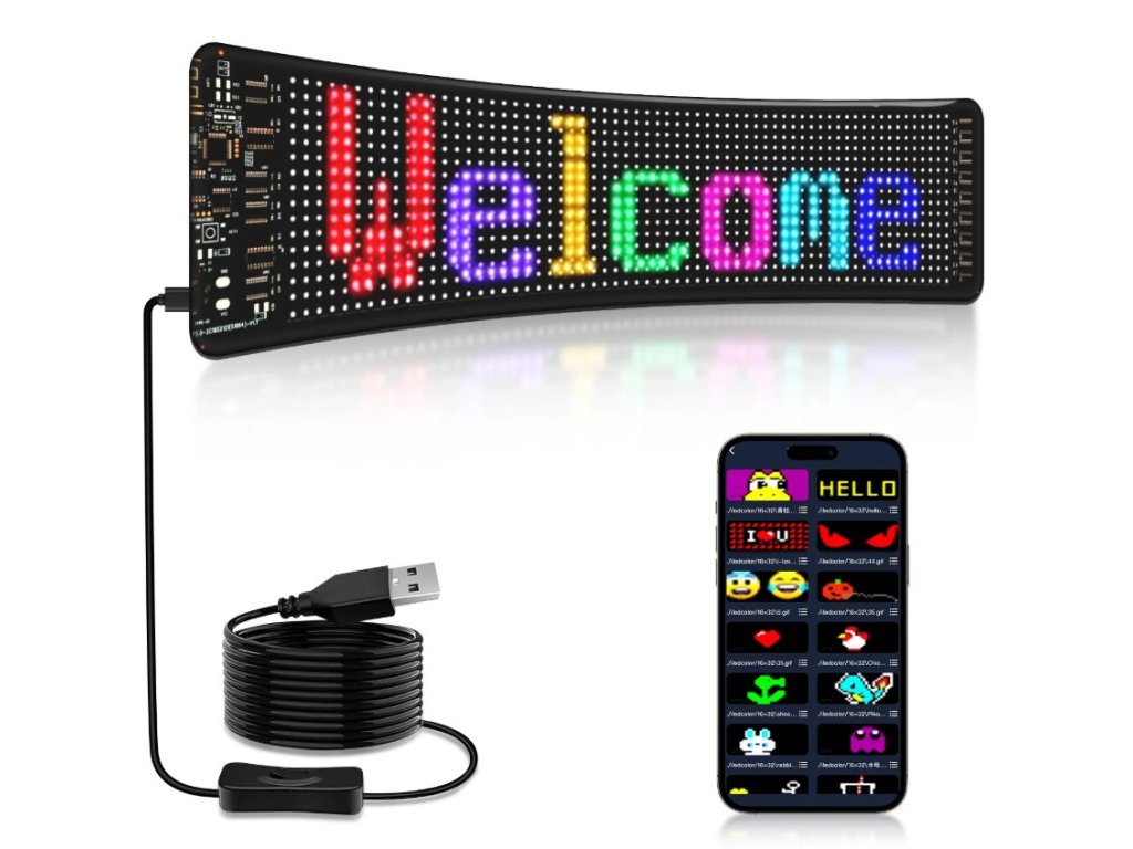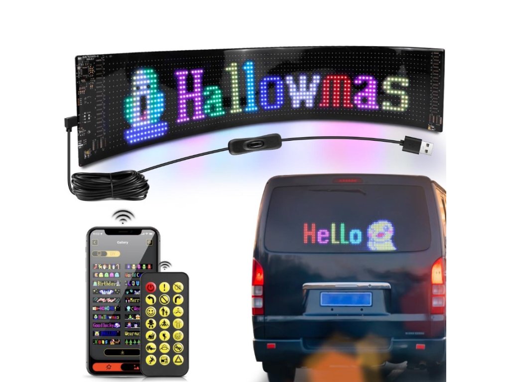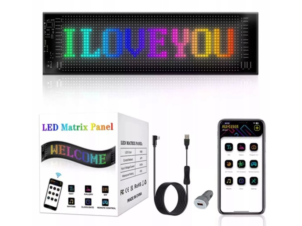 RGB LED Matrix Panel s LED diodami. Rozměr 20 x 90 cm. Celý panel je vyroben z umělých materiálů, takže je vysoce flexibilní a odolný vůči ohybům. Svícení je možné ovládat přes přibalený ovladač, nebo pomocí mobilní aplikaci, kde je také možné vytvářet své vlastní nápisy a designy. Napájení pomocí USB, kabel součástí balení.