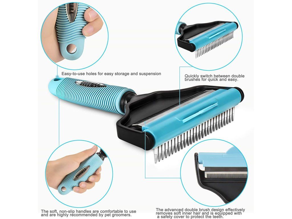 DUÁLNÍ HLAVA 2 V 1 - Kartáč na péči o domácí mazlíčky je dodáván se 2 oboustrannými hlavami s rovnoměrně rozmístěnými zuby, které rychle odstraní odumřelé nebo uvolněné chlupy podsady, uzly a spletence pro lepší výsledky péče.