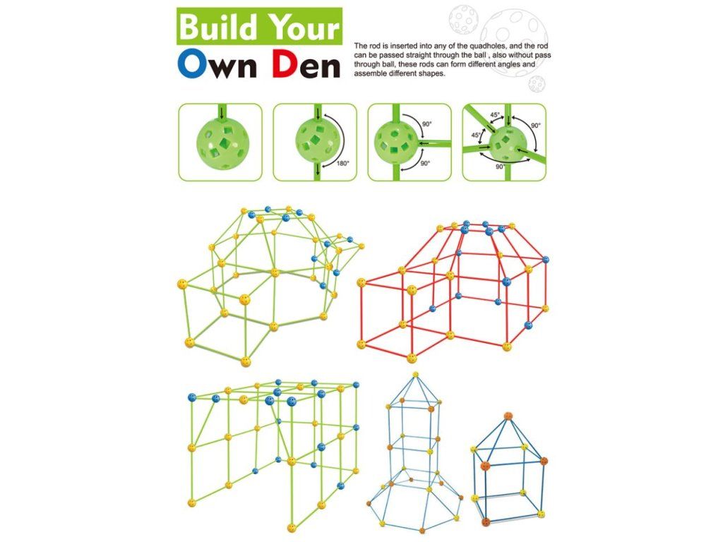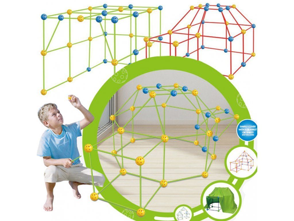 Pokud jste někdy v dětství chtěli postavit mrakodrap, raketu nebo pyramidu, nyní můžete! Je to jedinečná stavebnice, díky které mohou vaše děti postavit cokoli od základů. Pomocí univerzálních tyček jako nosníků a míčků jako spojovacích prvků můžete postavit cokoli od složitých pevností, jeskyně, hracího stanu, rakety, domu, iglú, zámku pro princezny, tunelu a dalších. Vytvoříte si hřiště kolem, kde se budete bavit!